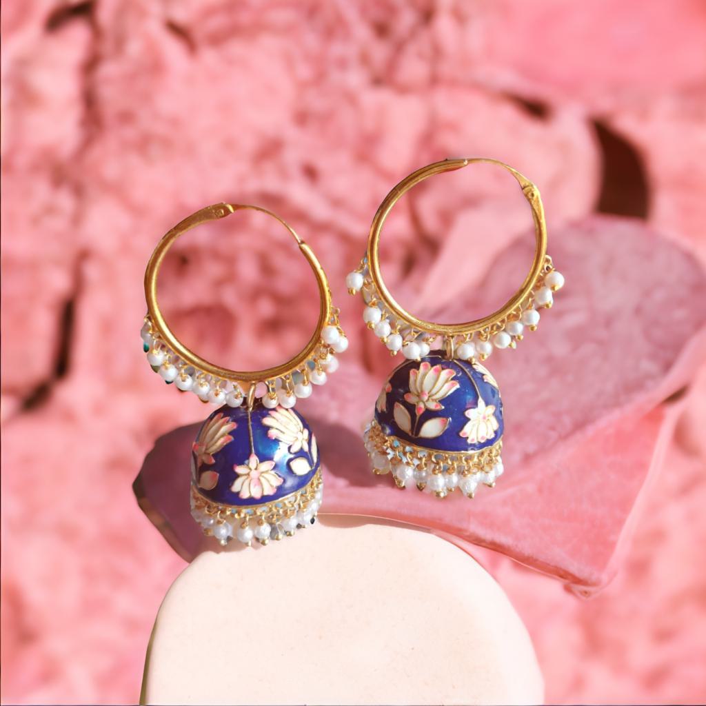 Blue jhumka earrings Floral jhumkas Pearl drop earrings Meenakari jhumka Brass Chandbali Earring